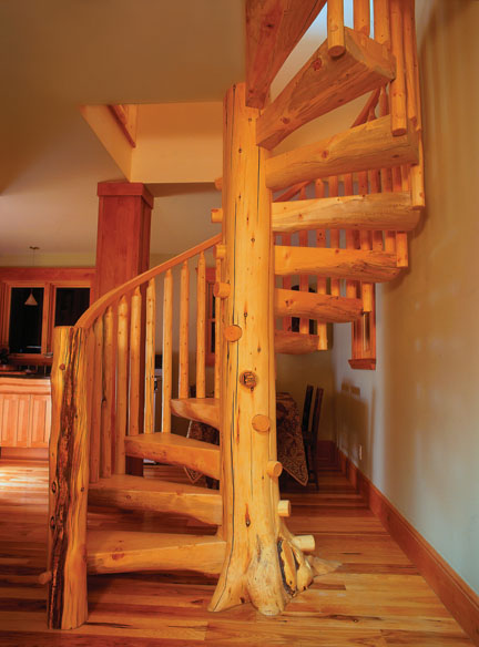 THE CLASSIC The StairMeïster “signature” spiral stair features a log column, or “tree,” with an optional root flare intact at the base.