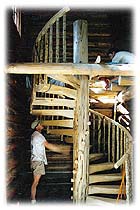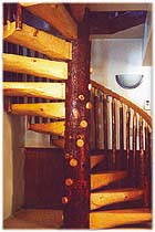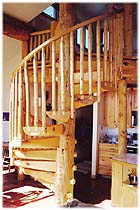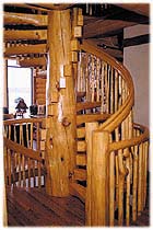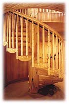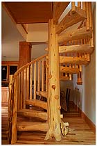 The Spiral Stair is StairMeister's signature product and is very often an architectural focal point in our clients' homes. Our stairs are constructed with unique log center columns, hand-sculpted log treads, individually-bent handrails with hand-hewn spindles that are typically dovetailed into the treads.