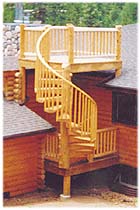 84" diameter Spiral Stair with 12" log center column and hand-carved log treads and balusters. 36" tread. Continuous hand rail on one side.