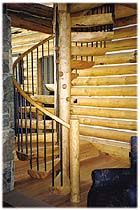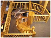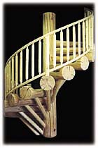 96" diameter Spiral Stair with 18" log center column and hand-carved log treads and balusters. 38" tread. Continuous hand rail on one side.